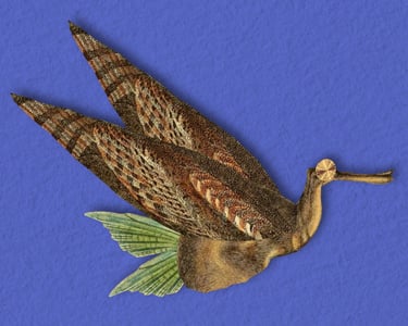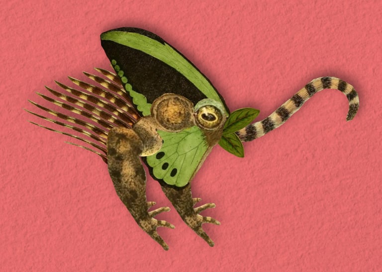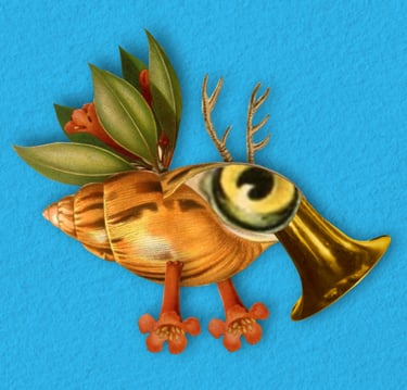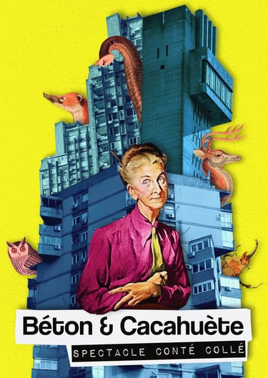 La conteuse Lisa Audoin tisse une toile faite de paysages sonores paisibles et de prose captivante tandis que l’illustrateur Harry Hadler découpe photos et gravures, et les colle ensemble pour créer des animaux fantastiques et des décors surréalistes, le tout racontant l’histoire de Cacahuète.