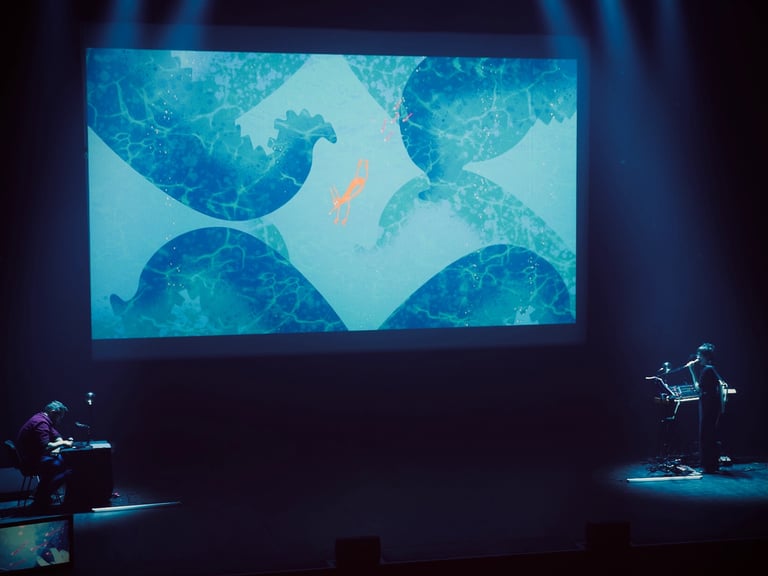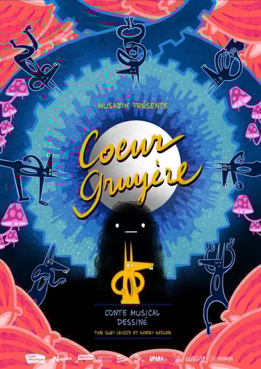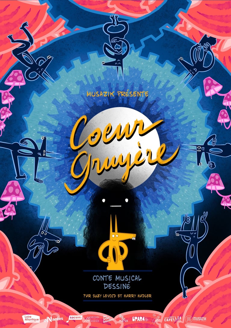 « Coeur Gruyère » est un conte musical dessiné dans lequel texte, musique et dessin se répondent pour construire en temps réel les décors d’une aventure immersive, loufoque et contemplative, mêlant réalité et fantaisie.