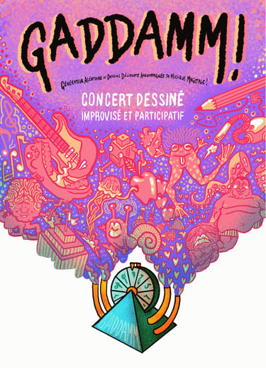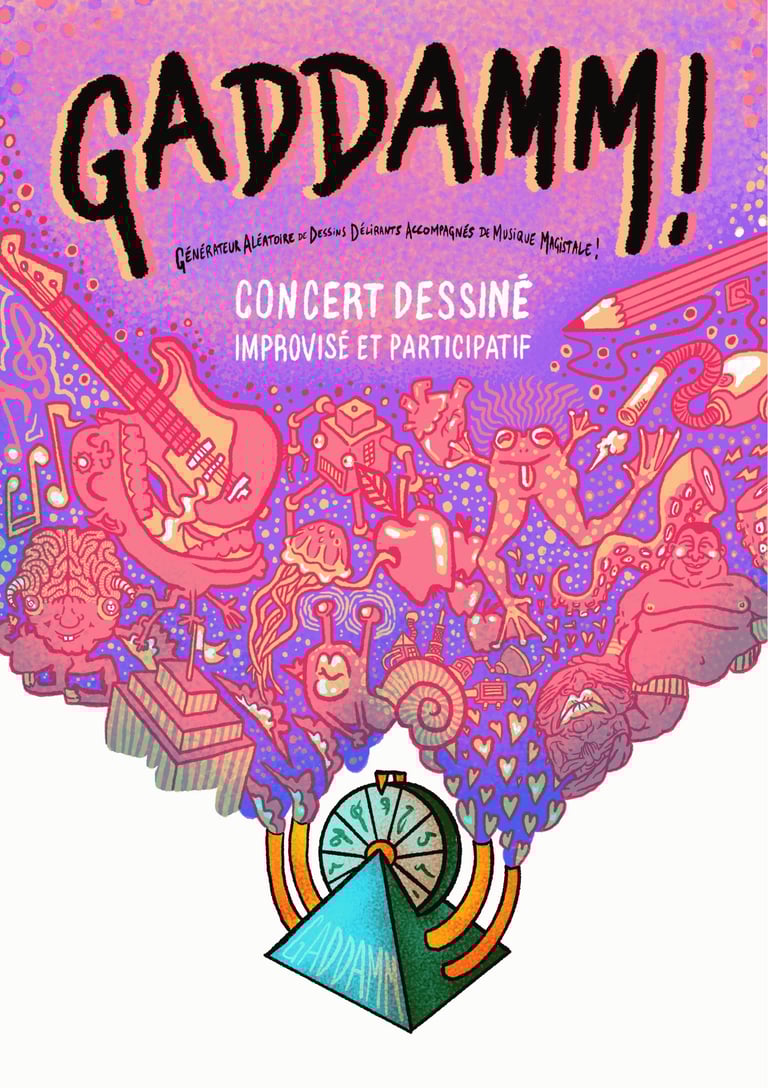 Pour commencer, il faut faire tourner la roue du GADDAMM, le Générateur Aléatoire de Dessins Dingos Accompagnés de Musique Maboule. Celui-ci donne le ton en proposant un thème. C’est ensuite au public de choisir le sujet à imposer à Harry et Suzy.